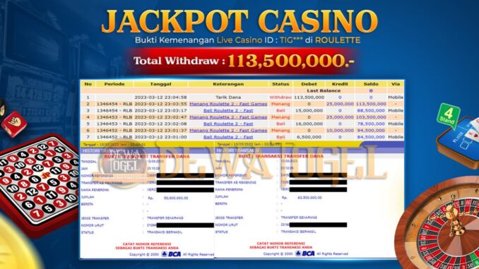 MEMBER DEWATOGEL MENERIMA PELUNASAN KEMENANGAN LIVE CASINO ROULETTE RP 113.500.000,- LUNAS